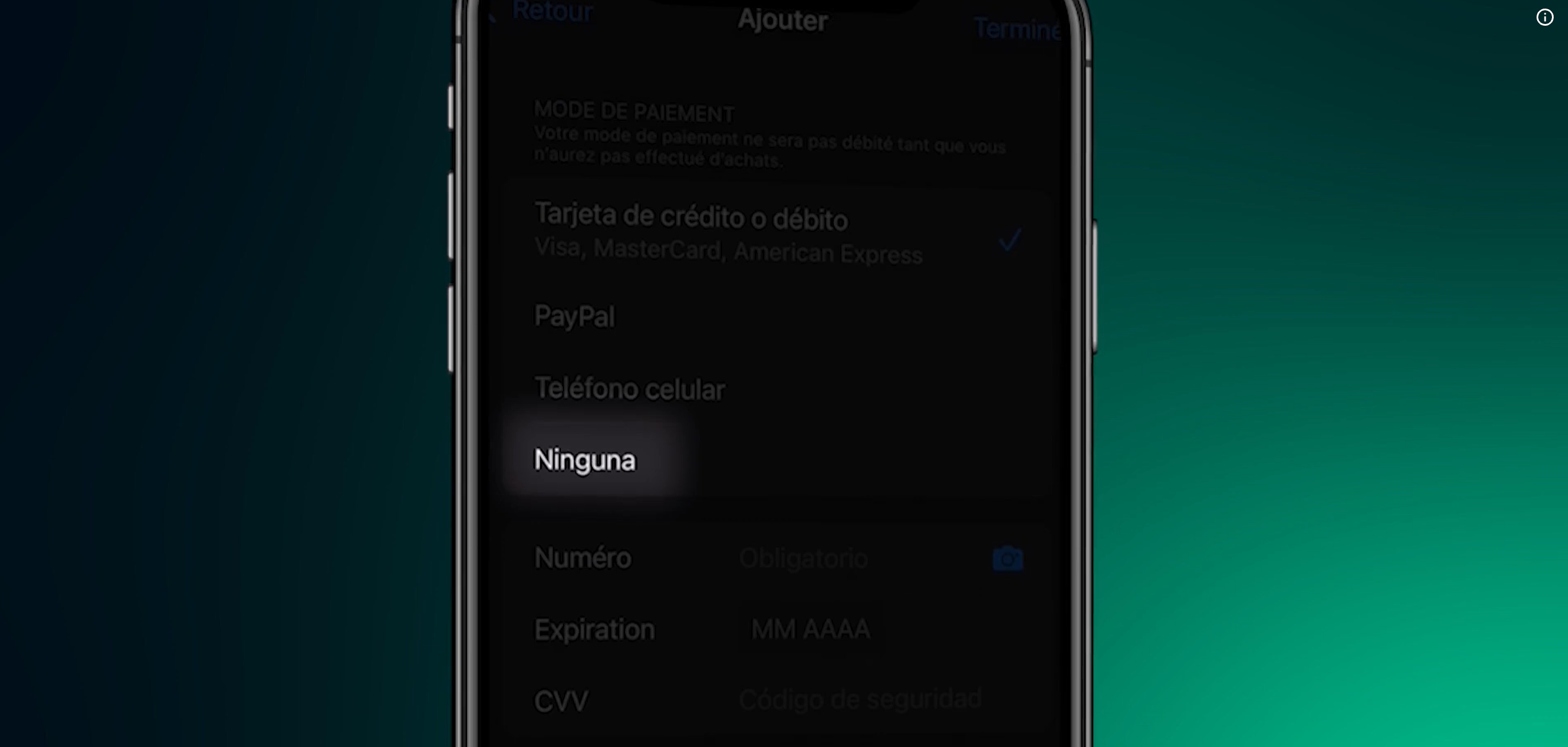 - Dans Moyen de paiement, sélectionne : Ninguna (Aucun)