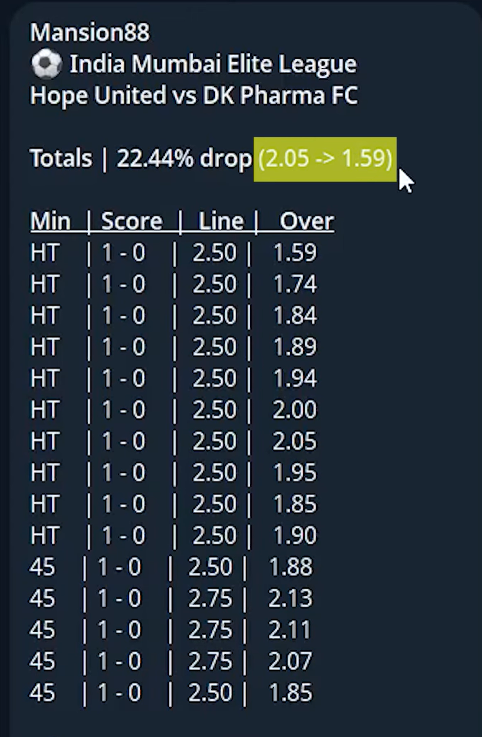 Sur un match de première division au Bangladesh, le bot a détecté une chute de cote de plus de 12 % sur un bookmaker asiatique.