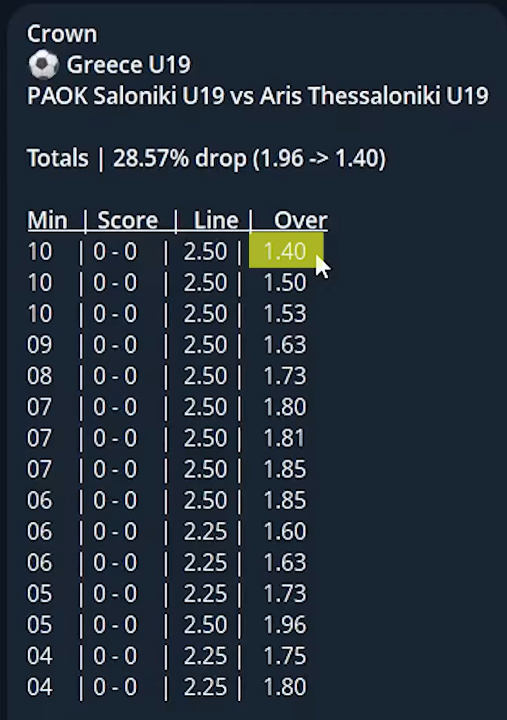 - 10e minute : over 2,5 à 1,40