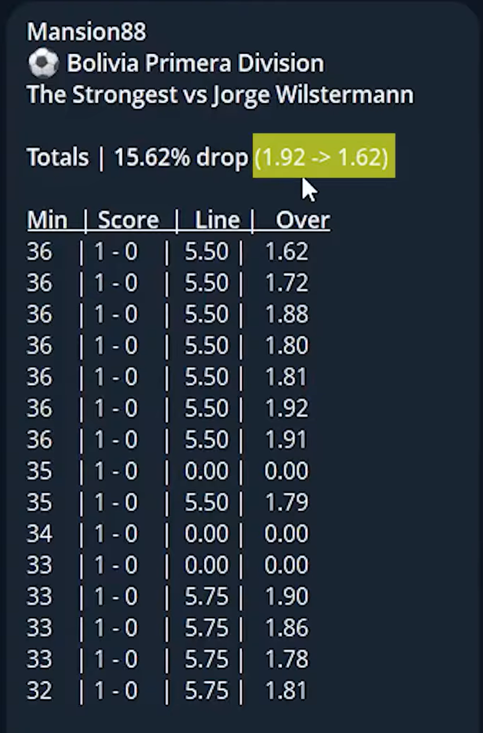 Exemple réel n°4 : Bolivie – over 5,5 à la 36e minute