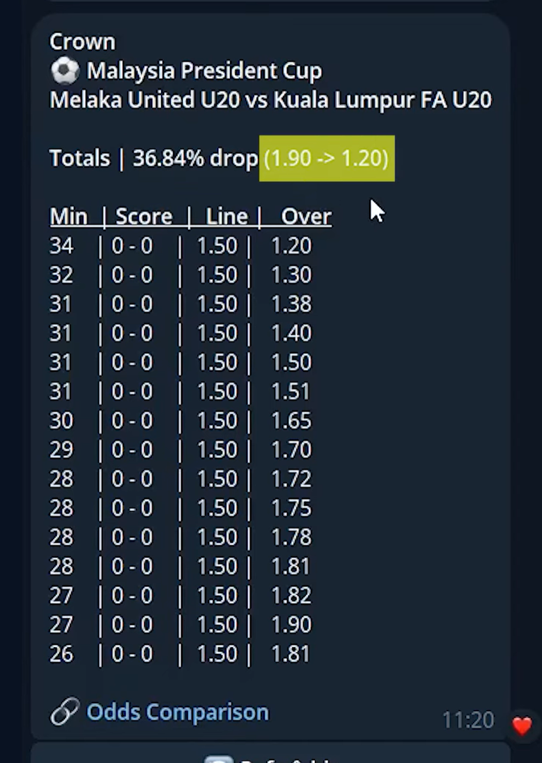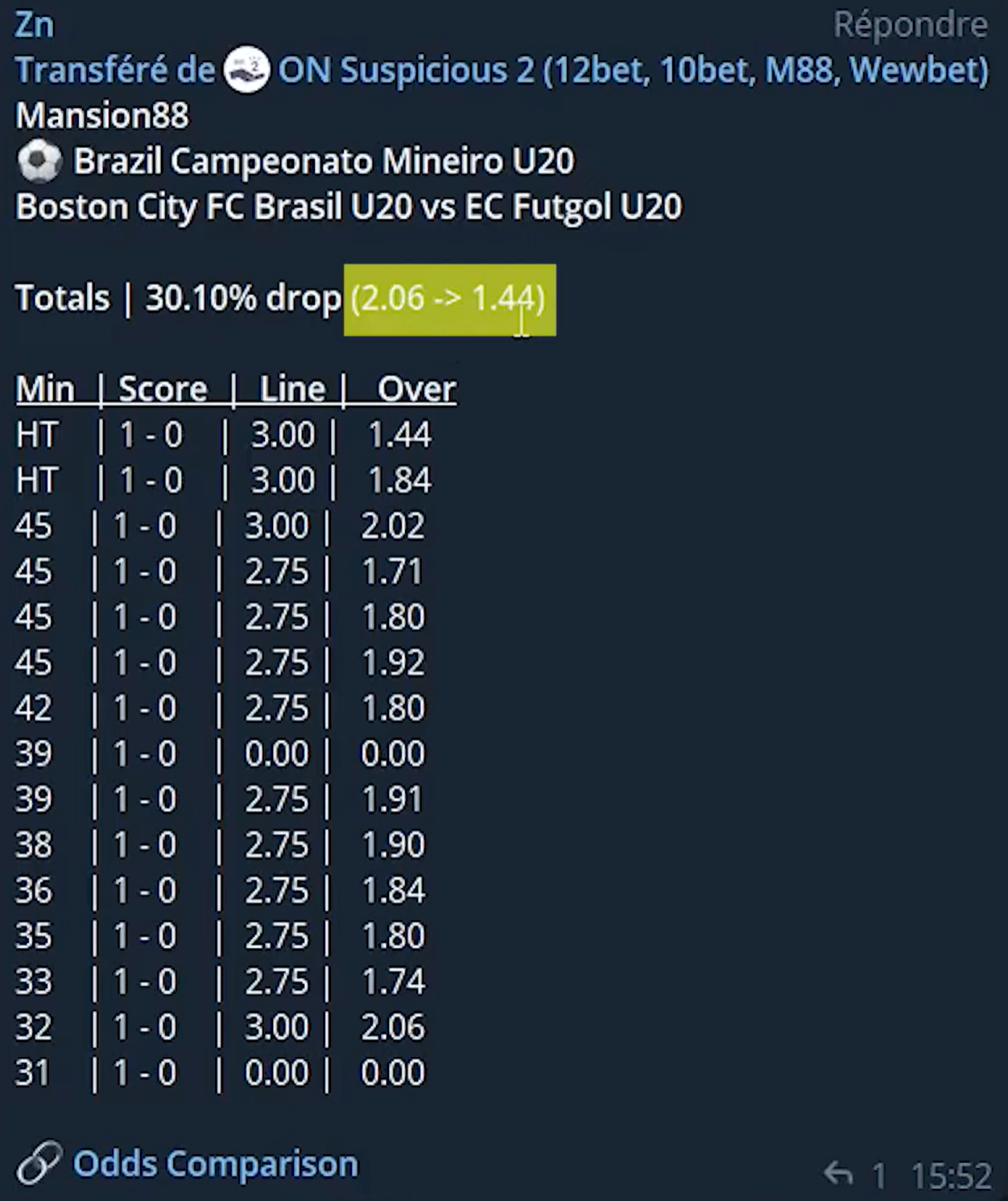 Le bot signalait une chute de cote de 36,84 % : la cote du plus de 1,5 but est passée de 1,90 à 1,20 alors que le score était encore de 0-0 à la 27e minute.
