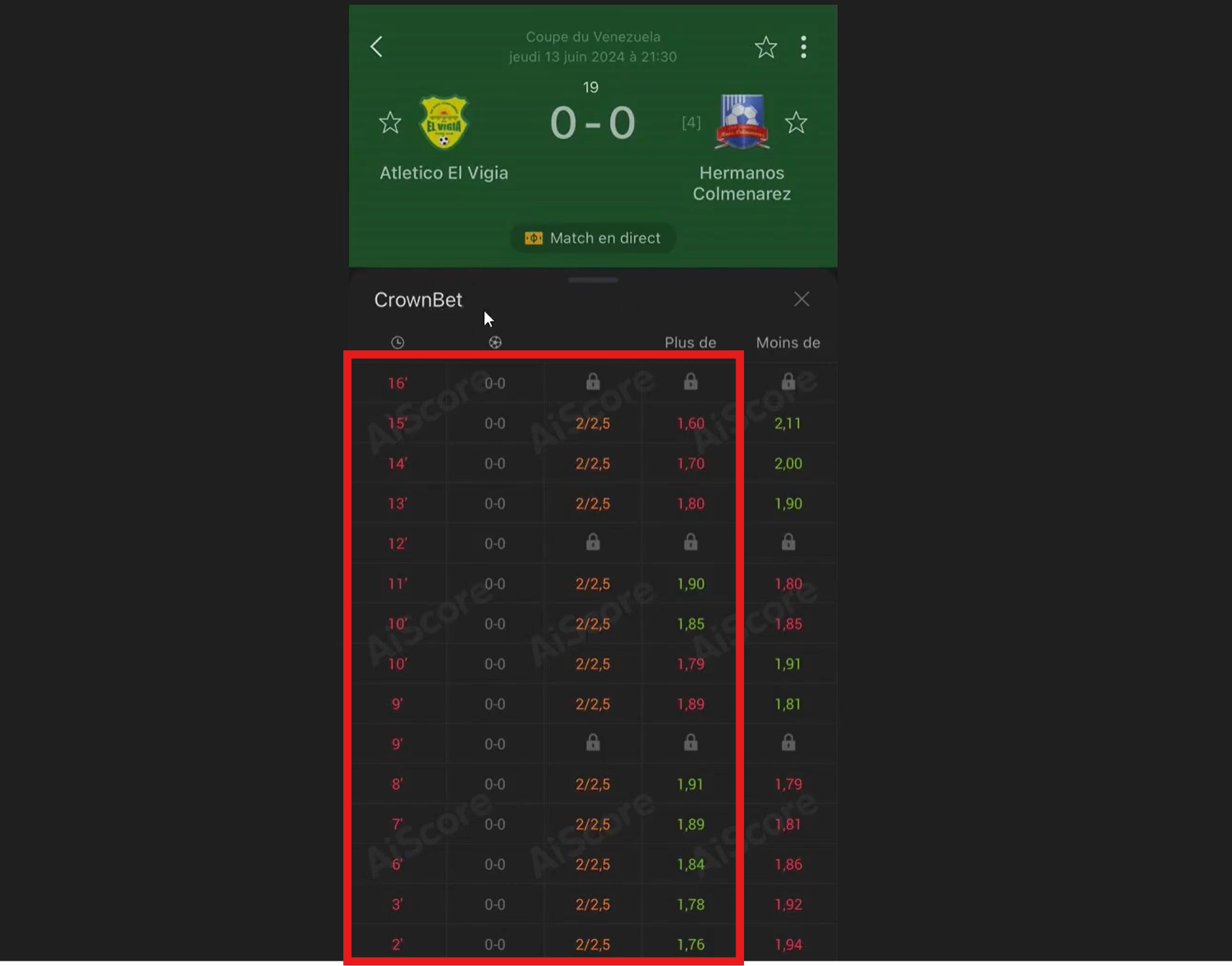 Sur AiScore, la cote de l’over 2,25 chute brutalement de 1,91 à 1,60 sans raison visible.