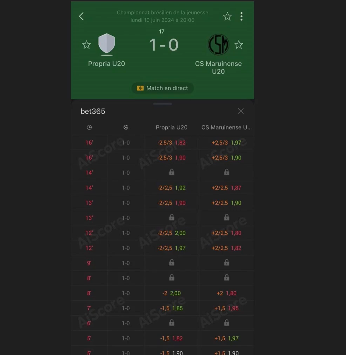 AiScore permet de suivre en temps réel les variations de cotes sur des bookmakers asiatiques comme CrownBet ou SBOBET.