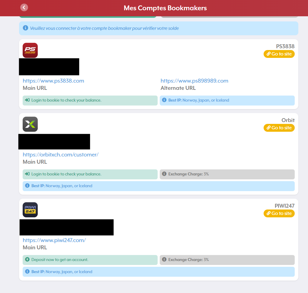 C'est encore plus simple. Connecte-toi à ton tableau de bord, va dans « Mes comptes bookmaker », sélectionne Piwi247, dépose tes fonds, et Asian Connect t'envoie directement tes identifiants Piwi247 avec ton argent dessus.